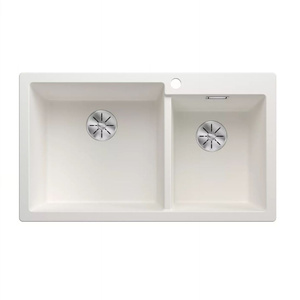 Zlewozmywak Blanco Pleon 6 Split Silgranit delikatny biały lewa zlew wpuszczany w blat jednokomorowy z odpływem InFino korek automatyczny o ponadczasowym eleganckim kształcie