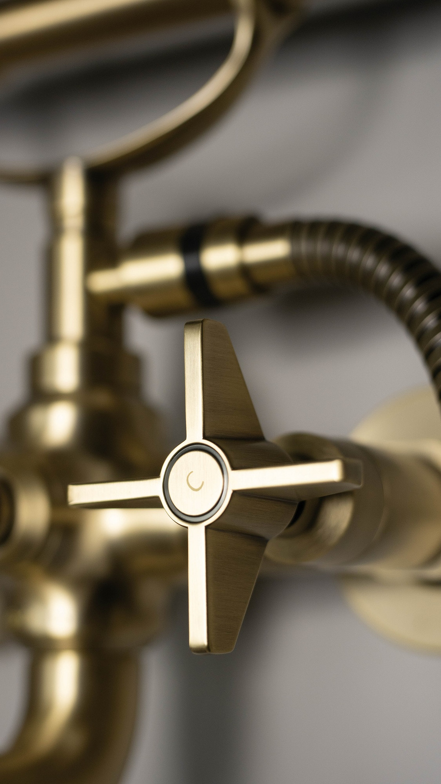 Ścienna bateria wannowa z kompletem natryskowym z kolekcji Temisto to najlepszy przykład wzorcowego połączenia stylu z nowoczesną technologią i designem. Podobnie jak wszystkie baterie z tej wielokrotnie nagradzanej kolekcji, również ta bateria jest baterią dwuuchwytową i charakteryzuje się stylizowanymi pokrętłami ciepłej i zimnej wody. Wylewka baterii również ma retro charakter i wyposażona została w ruchomy aerator napowietrzający strumień oraz mechaniczny przełącznik, który umożliwia przełączenie źródła wody z wylewki na słuchawkę nawet przy małym strumieniu. Znajdująca się w komplecie słuchawka prysznicowa z wężem o długości 1,5 m ma geometryczną formę, która doskonale współgra z całością. Ceramiczna głowica o kącie obrotu 90° oraz siedmioletnia gwarancja producenta to dodatkowe atuty tego produktu. Prezentowana tu bateria wannowa z kompletem natryskowym ma luksusowe, mosiężne wykończenie, które nie tylko nawiązuje do retro stylistyki kolekcji, ale dzięki innowacyjnej technologii pokrycia, jest także wyjątkowo trwałe. Kolekcja Temisto została finalistką takich nagród jak Must Have 2020, "Łazienka" - wybór roku 2020 i Top Design 2020, co jest gwarancją najlepszej jakości i designu.
